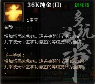 36K纯金,增加伤害减免可以让你更能挨打一点,而且可以把牌子升为金牌,能让你拿到更多开光小首饰去换坐骑啊,命格啊,这都是不错的。