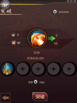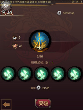 1、 升级武技或者兵法时,要选择五个相同的武技或者兵法作为消耗材料,会获得额外经验,如图