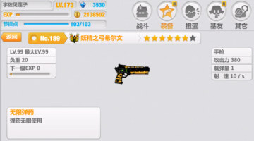 在崩坏学园2游戏中,手枪神器妖精之弓希尔文有着无限弹药的特性,磨磨党的最爱,下面给大家带来这把神器满级时的属性和使用分析。