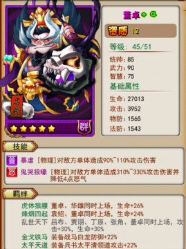 董卓:先手控,减怒4点,神马郭嘉、张飞的,统统静声。后手格挡,好吧,几率太低,但50%的生命、22%的防御加成铸就了他的肉!全体群雄10%攻击光环。所有格挡阵容中独一无二,傲视群雄的天赋。