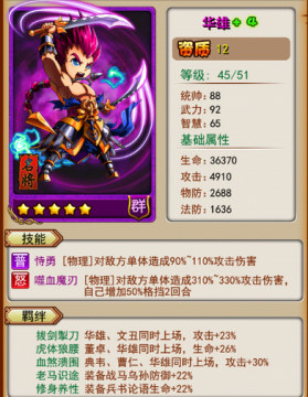 华雄:技能50%,天赋30%的格挡几率意味着神马大家都懂。后期60%的突袭,意味着一上场就能打出近400%的攻击,秒人主力。后期物理减伤24%,呵呵呵呵,再加格挡,求你打出高爆发。
