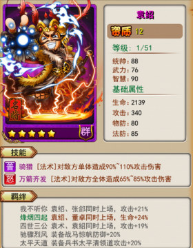 袁绍:很多人都认为袁绍是个垃圾,显然,技能伤害低,无特殊BUFF,但关键还是看你怎么用。5个羁绊点亮4个没问题吧?羁绊的加成算是中规中矩了。比很多亮1、2个的13星要强吧?格挡30%,我要说袁绍是群雄格挡流的核心你信么?暴击10%,这个算添头。战意28%的攻击加成这才是重点。羁绊满的情况下加战意88%的攻击加成你敢信?后期攻击80%附毒,什么概念,换算成攻击加成随便破100%。这样的攻击力不强力什么还算强力?非R、小R你不另辟蹊径能有救?