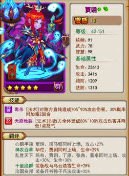 贾诩:很多人说贾诩后期不行,我只想说你数学不行...和华佗有羁绊这是其一。没有司马,没有吕布,所以武将羁绊亮一个就够了,你没听错。贾诩的技能在没有全民+5前作用非常大,延迟对手晚一回合出技能。全民+5后,呵呵呵,贾诩对所有人攻击+18%。这才是对上句话的补充,武将羁绊亮一个就够了。后期24%物理防御加成,54%生命加成,43%攻击加成。有几个13星能比?
