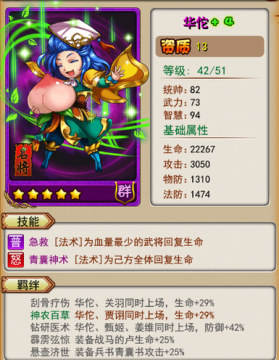 华佗:最强奶爸。份属群雄。够了吗?全阵容25个羁绊,拥有全体10%攻击加成。后手格挡流。攻击力,优于中R。防御力,脸不黑出格挡的情况下,比肩大R。