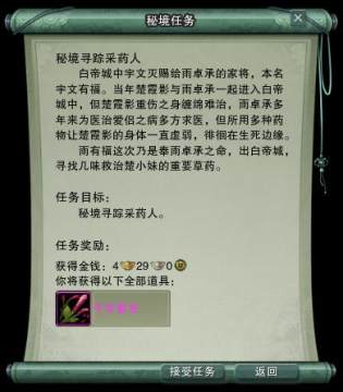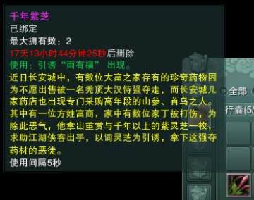 注:【千年紫芝】最大拥有数量为2。即如果侠士已有2个未使用,将无法再完成“秘境寻踪采药人”日常任务,所以还请各位侠士尽早使用哦。