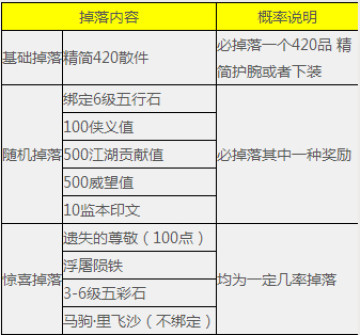 每次击败恶徒“雨有福”,均会掉落一个小队拾取的420品精简装备(护腕或下装),以及江湖贡献/威望/侠义/监本印文等数值奖励,此外,有缘的侠士还有几率获得遗失的尊敬、浮屠陨铁、3-6级五彩石、不绑定马驹·里飞沙等稀世珍品!每位侠士每日可挑战“雨有福”的次数不限。