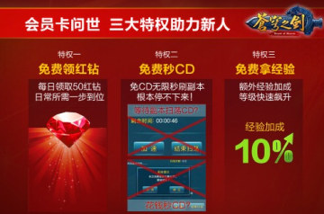此次福利版更新,最大亮点莫过于为新玩家量身订做的会员卡。每一位「苍穹之剑3D」的新手玩家都可以通过新服奖励获得会员卡,享受到刷副本“免费秒CD”的待遇。所有副本扫荡一键免费秒刷,省时省蓝钻!此外,拥有苍穹会员卡的玩家,不仅可以每天免费领取50红钻,还可以获得额外经验加成,从而快速提升等级。三大会员特权让新手玩家赢在起跑线。