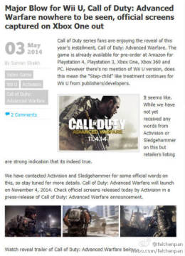 《使命召唤11高级战争》WiiU版现今尚未公布 来源: 飞翔小编feichenpan 2014/5/4 20:34:44 浏览量:153 根据国外游戏网站gamepur的最新消息,动视公司旗下射击新作《使命召唤11高级战争》预计2014年11月4日发售,登陆PC,PS3,PS4,XBOX360,XBOX ONE几乎所有游戏平台,唯独没有WiiU主机平台,这让不少任天堂玩家大失所望。《使命召唤11高级战争》是否有WiiU版还有待确定,还需等待动视官方的最新消息。
