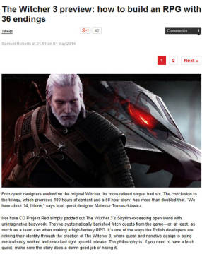 2.有14个人负责设计支线任务,其中4个参与过巫师1的制作,6个人参与过巫师2