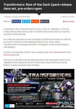 《变形金刚 暗焰崛起》发售日曝光 6月24日上市 来源: 飞翔小编feichenpan 2014/5/5 21:17:32 浏览量:304 根据国外著名游戏网站VG247的消息,动视官方终于公布了《变形金刚 暗焰崛起(Transformers:Rise of the Dark Spark)》的发售日,该作预计2014年6月24日登陆北美地区,6月25日登陆澳大利亚,其对应平台为3DS、PC、PS3、PS4、WiiU、XBOX360和XBOX ONE,各位变形金刚系列粉丝不要错过了这款游戏新作。