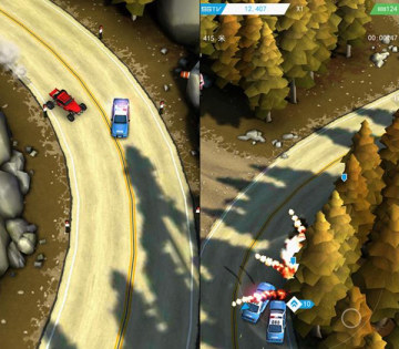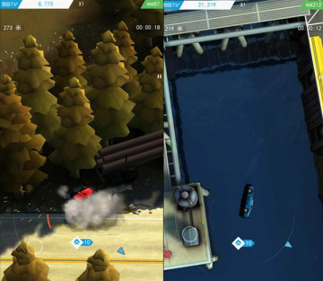 与其他同类游戏相比,《飙车飞盗》上手还是比较困难的,游戏没有设置重力感应操作方式,全程操作只靠屏幕下方的一个圆点来完成,按住圆点发动车辆,左右旋转圆点即可完成转弯。看似简单,但是真正上手后你会发现这种转弯方式真的很难适应,而且相当的灵活,很难精准的完成转弯等操作,稍有不慎就可能车毁人亡。在警车进入攻击范围后,玩机还可以通过点击警车的方式来做出暴力撞击方式,一下即可将警车撞翻,非常爽。游戏中会有小箭头的指示,撞坏箭头指示的这些物体还可以获得额外的收获。在享受撞击带来的快感的同时也不要忘记关心一下车辆的受损程度,当车辆冒出浓浓的黑烟时就意味着赛车将要爆炸了。