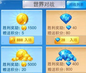 在即将到来的世界对战系统中,分为钻石场和金币场。入场时扣除相应的入场费后,系统将实时为您匹配对手,在PK中胜利了可以获得丰厚的胜利奖励!