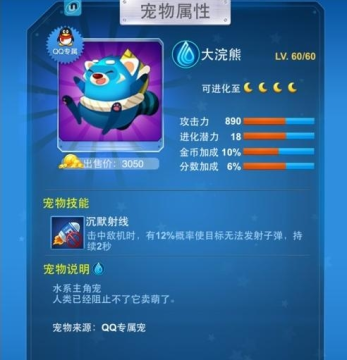 宠物技能:击中敌机的时候,有12%概率时目标无法发射子弹,持续2秒。