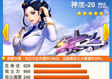 神鹰-20,战机的攻击方式为全导弹攻击,左右两排的跟踪导弹更是不留落网之鱼。满级攻击力900,加上“荣誉勋章”技能所额外提供的100点攻击力提升,满级攻击力就将达到1000,是无可置疑的最强攻击者。另外在近距离攻击是伤害还将提升30%,在对付魔鬼阵列或被逼到绝境时绝对是不可或缺的神技。