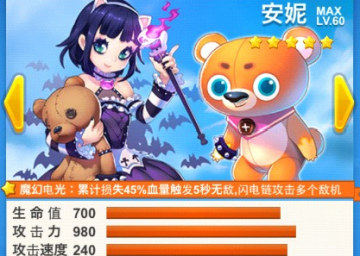 安妮,拥有活泼可爱的小萝莉外形。 满级生命值700的安妮,必将成为战机中最经得起“击打”的熊孩子。其累计损失45%血量后触发的5秒无敌,更是体现了魔熊保护安妮时的尽心尽力。
