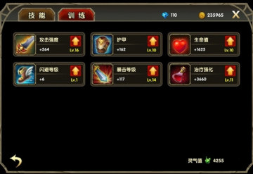 其次,训练也是提升战斗力的一种好方法。在训练界面中,你可以强化攻击强度、护甲、生命值、闪避等级、暴击等级以及治疗强度等,你可以通过消耗灵气值去提升相应的等级。记得,每个技能所能提高到的最大等级,就是你角色的当前等级,想要继续升技能么,那就加油练级吧。