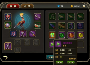 最后,你也可以通过“镶嵌”系统区提升自己的战斗力。当进入到镶嵌界面中时,你可以选择一件装备,然后再背包中挑选宝石,然后镶嵌进去。我们可以通过合成系统得到品质更高的宝石。当我们的装备镶嵌进强力的宝石之后,我们就又向强力之路迈进了一大步呢。