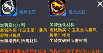 经过一番悉心的培养后,坐骑达到5阶就可召唤坐骑并且驾驭它。培养坐骑需要道具“培养之石”,突破升阶需要道具“进化之石”。这两种材料都可在游戏内的特定活动中获得或者从商城购买。