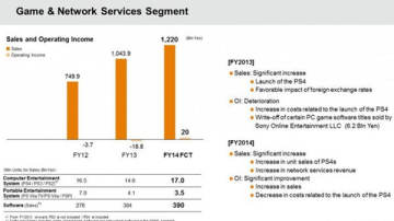 索尼也希望新财年游戏部门有大幅度的销量提升。主要期望于PS4硬件销量带动,以及PSN的收入。此外营业利润预计会有大幅提升,主要是因为PS4发售后成本降低的缘故。