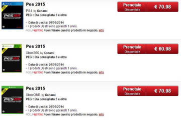 国外著名游戏零售商Gamestop日前在其意大利官网上曝光了Konami足球游戏《实况足球2015》的发售日,该作将于2014年9月26日发售上市,此外官网页面还公布了《实况足球2015》PS4,XBOX360和XBOX ONE版本封面,不过PS3与PC版并没有标出。