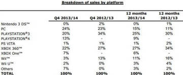 育碧2013年度财政报表曝光 赤字1700万 来源: 飞翔小编 2014/5/16 15:05:14 浏览量:325 育碧公司在近日曝光了其2013年度财政报表,其中赤字1700万,较去年的1.43亿利润大幅下滑,官方表示现今正经历主机换代的阵痛期,尽管未达到预期盈利目标,但是传统大作像《刺客信条4》等大作还是取得非常大的成功,同时像《南方公园 真理之杖》等作品也在PS3和XBOX360等平台有不错销量,同时数字化版的游戏销量也占到了19%。育碧游戏平台销售比例分布:PS3+PS4占33%、XBOX360+XBOX ONE占29%、PC平台24%、Wii+WiiU占5%(较去年13%呈下降)
