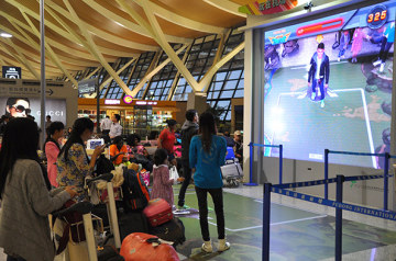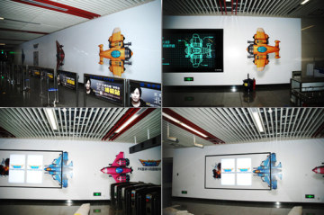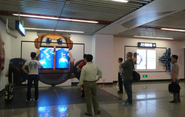 在北京朝阳门地铁站可以看到富有空战特色的墙面广告,让玩家感受到《全民飞机大战》不仅在手机屏幕中,还在你我的身边。互动体验摆脱了传统手游指尖比拼的形式,将《全民飞机大战》与体感技术结合在一起,玩家可以用手势来控制飞机的飞行。特设的双人PK体验,令玩家体验到空战PK的刺激爽快。路人经过无不驻足观望,大部分玩家都身体力行前去尝试,男女老少井然有序,成为人群中一道亮丽的风景线!体感技术的游戏方式已经彻底点燃了玩家们的热情,玩家们不断的用各种动作操作战机,既娱乐又健身,《全民飞机大战》的热度,已经从指尖传递到身体的各个部分。