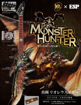 为了纪念《怪物猎人》系列10周年,Capcom公司与著名吉他制造商ESP合作推出炎剑雄火龙吉他,从实物图外观上看简直帅到没朋友,中二度也爆棚,当然其售价也是丧心病狂地达到230万日元,约14万人民币,预计2014年夏开始预订,采用预约生产制,各位感兴趣的怪物猎人死忠不要错过了。