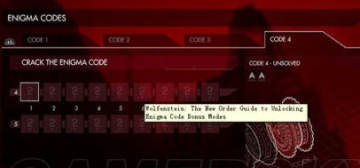 在《重返德军总部 秩序》游戏界面有个EXTRAS选项,选项里的第一个ENIGMA CODES选项点可以输入密码code,一个有四组,在游戏里收集ENIGMA相关的文件,如果一个code满了(所有数字全部集齐并可以转动),就可以转动这些数字,按照以下数字排列,就会解开相应的游戏模式。