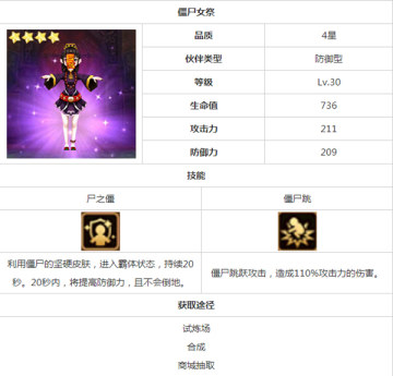 《全民打怪兽》僵尸女祭技能属性获得方法详解 来源: 飞翔小编 2014/5/27 16:02:47 浏览量:251 在全民打怪兽游戏中,僵尸女祭是四星品质的防御型伙伴,虽说是僵尸,不过却是皮肤过于白皙的可爱萝莉,下面一起看看她的技能、属性及获得方法吧。