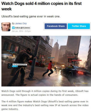 《看门狗》首周销量400万套 力超《马里奥赛车8》 来源: 飞翔小编feichenpan 2014/6/4 22:53:56 浏览量:324 根据国外游戏网站videogamer报道,《看门狗》首周销量400万套,开创了旗下游戏销售速度的新记录,育碧英国官方表示《看门狗》巨大成功证明育碧在次世代树立新游戏品牌的卓越能力。而与该作同期发售的任天堂WiiU游戏《马里奥赛车8》首周销量120万,虽说成绩不错,但也只能在游戏销量排行榜上屈居亚军。