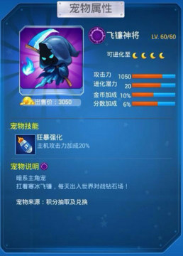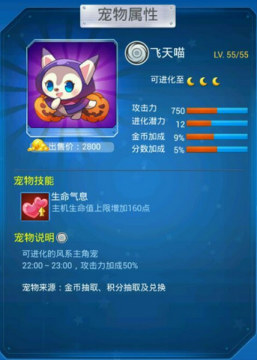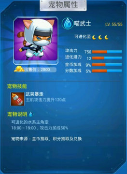 说实话,我并不怎么推荐用这个组合。因为喵武士攻击本来就低,两只喵武士也只能给战机增加240点攻击力。但是,三月宠的价格是亲民的,而且水系很好进化。值得一提的是,该宠物在每天18点-19点,攻击力增加50%,也就是说,满级喵武士在这个时间段,自身的攻击力能达到750+375=1125。