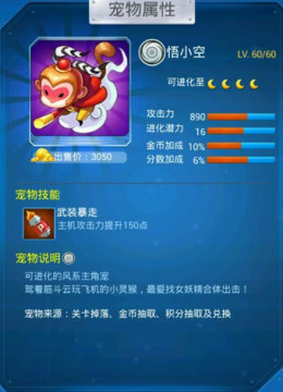 悟空目前可谓算是在这次更新的宠物中,比较给力的一只了。优势在于它来自比较普遍的风系,再加上自身还不错的技能。两只悟空,可以为战机带来300点的攻击力,在加攻击上,仅比飞廉神将要低,价格也会低得多。在价值上,升满它还是很不错的。