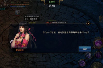 经过了怪物关卡以后,我们会登上下一层塔。整个活动持续时间为3分钟,我们要做的就是在这3分钟之内尽可能的打到更高层,而每一层除了会遭遇先前遇到的低级小怪以外,还会随机触发两个时间,它们分别是足球宝贝和足球裁判。足球宝贝是两人一对的清凉美女,她们的责任就是向玩家普及足球知识,和她们对话可以获得一些足球的入门心得,还有每个国家的足球趣闻。但是要注意的是,这两个足球宝贝只有一个是可以让你登上下一层的,如果选错的话将会留在本层触发下一次事件。