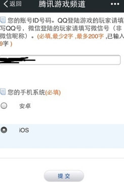 3、填写问卷(3个问题,一个是问玩家是QQ登录游戏还是微信登录游戏,第2个是填写帐号,另外一个是问玩家的手机系统),填写完了之后点击“提交”即可。