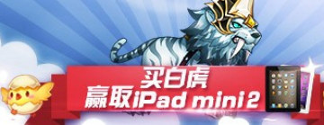 活动内容:活动期间,小伙伴们购买新坐骑糖白虎,即有可能获得ipad mini2一部。活动结束后,将会在所有购买糖白虎玩家里共随机抽取5名玩家给予ipad mini2一部!
