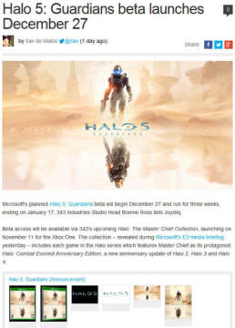根据国外游戏网站joystiq的报道,微软计划将于2014年12月27日开启《光环5守护者Halo5 Guardians》beta版测试,其将持续三个星期,一直到2015年1月17日结束。而光环5的beta测试码将会在今年11月11日发售的《光环士官长合集Halo: The Master Chief Collection》内附赠,各位XBOX ONE玩家不要错过了。