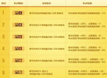 随着每个帐号内消耗疲劳值达到156点的角色数目增多,活动Buff将会从阶段1上升至阶段6!