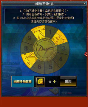 使用【幸运的金币碎片】会随机得到 1-10 号金币碎片中的一片,【幸运的金币碎片】拾起后会被放置在在材料栏中。其中代表DNF六周年的6号金币碎片非常珍贵和稀少,如果获得了6号碎片,那将是非常幸运的!
