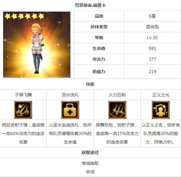 《全民打怪兽》罚罪使者.丽蓓卡属性技能介绍 来源: 飞翔小编 2014/6/20 9:57:46 浏览量:367 在全民打怪兽游戏中,罚罪使者.丽蓓卡也是第二期推出的六星伙伴,这是位拿着冲锋枪穿着黑丝的金发妹子。下面给大家带来丽蓓卡的属性技能及使用分析基本信息使用分析罚罪使者.丽蓓卡是六星混合型伙伴,一三技能都是发射子弹造成连击伤害,二技能能够缓慢恢复生命,四技能是一个全队防御加成buff,如此看来丽蓓卡像辅助型伙伴多过于混合型伙伴。