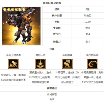 作为攻击型伙伴,迷宫巨魔.米诺陶可谓名符其实四项技能全是输出技能,二技能减速,三技能降防,为数不多的不带任何防御技能的伙伴。
