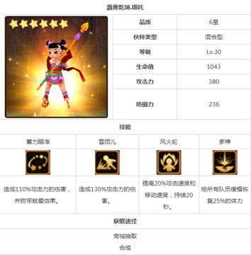 《全民打怪兽》霹雳乾坤.哪吒属性技能介绍 来源: 飞翔小编 2014/6/20 17:11:41 浏览量:293 在全民打怪兽游戏中,霹雳乾坤.哪吒是六星混合型伙伴,目前为数不多的中国风伙伴,下面给大家带来他的属性技能及使用分析。基本信息使用分析霹雳乾坤.哪吒是混合型伙伴,一技能输出附带眩晕,二技能输出,三技能加攻速移速buff,四技能能为全队回复25%的体力,是一个生存输出并重的伙伴。
