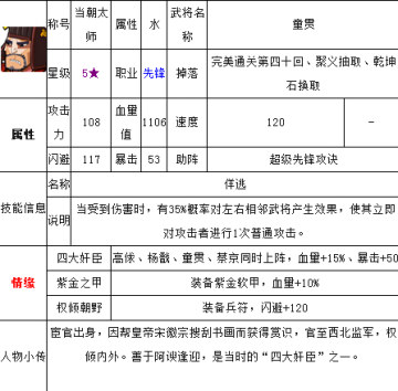 作为当朝太师,其品级自然不会低(五星紫卡),其技能更是奸诈,当受到伤害时,有35%概率对左右相邻武将产生效果,使其立即对攻击者进行1次普通攻击(还拉同盟)。