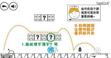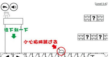 4、来到第二个“?”号位置停下,顶出毒药,这个时候会看到一个怪物,此时怪物的跳跃是根据你的操作而动,我们要做的是让其避开这瓶毒药,等待合适的时机让怪物避开毒药并且让其跳上一层平台之上。继续等待怪物走到平台的左端,让他起跳,这样他就不会触发前面的地刺陷阱。