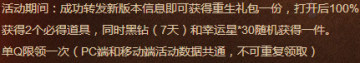 DNF黑钻免费领勇士重生礼包领取方法 来源: 飞翔小编 2014/6/25 9:06:23 浏览量:466 在DNF游戏中,6月17日到7月17日之间,玩家只需微博转载DNF新版本消息,即可领取勇士重生礼包,这次玩家有极大概率免费得到七天黑钻哦。活动时间:6月17日-7月17日活动内容:礼包内容:礼包领取地址入口