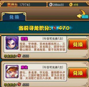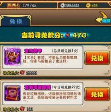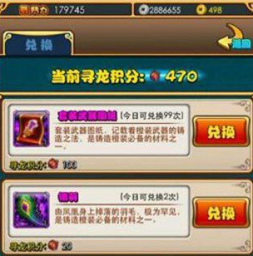 上面有说到寻龙探宝可以获得积分的,不同的迷宫层战斗可以获得一定的积分,而获得的寻龙积分可以用以兑换主角紫装、橙装图纸、橙装铸造材料、以及各种新出的紫将。