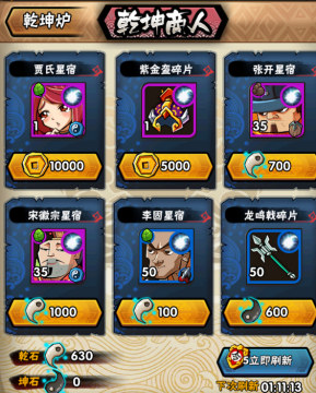 炼化界面我们可以看到有一个乾坤商人,在乾坤商人处可以使用乾坤石和铜币兑换武将星宿和蓝紫装的碎片。系统会刷定时刷新所能兑换的物品,我们也可以花费令牌或者银票进行刷新。紫色的武将或装备需要100个碎片才能兑换,蓝色品质的只需要50个碎片就能兑换了。