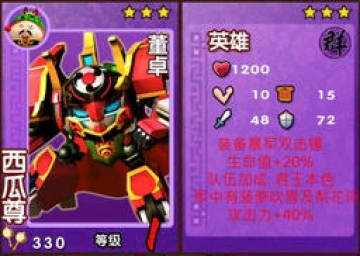 小编点评:西瓜尊生命、防御、护甲都处于优势,武器加成和队伍加成也能增加很多生命值和攻击力,是攻击防御的上选,不过价格也最高,属于土豪必备型。