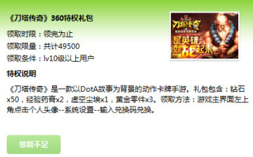 《刀塔传奇》360特权礼包领取方法 来源: 飞翔小编 2014/6/30 9:34:24 浏览量:520 刀塔传奇是时下最热门的卡牌手游之一,深受广大玩家欢迎,想必大家都对免费礼包感兴趣,这里给大家带来刀塔传奇360特权礼包的领取方法。1、如图点击右上角请登录,登陆360手机助手账号,然后点击请登录这里,进入个人中心领取游戏特权(账号和安全卫士账号可以通用,不过等级不一样);2、360手机助手账号达到等级后就可以,点击立即领取获取礼包特权码;3、刀塔传奇360特权礼包内容一览