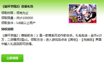 《崩坏学园2》360洛基礼包领取方法 来源: 飞翔小编 2014/6/30 9:44:41 浏览量:3775 崩坏学园2是时下最热门的无节操枪战动作手游,深受广大玩家欢迎,想必大家都对免费礼包感兴趣,这里给大家带来《崩坏学园2》360洛基礼包的领取方法。1、如图点击右上角请登录,登陆360手机助手账号,登陆后再次点击此处进入个人中心领取游戏特权(账号和安全卫士账号可以通用,不过等级不一样);2、360手机助手账号达到等级后就可以,点击立即领取获取礼包特权码;3、《崩坏学园2》360洛基礼包内容一览