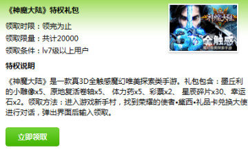 《神魔大陆》360特权礼包领取方法 来源: 飞翔小编 2014/6/30 9:39:37 浏览量:1338 神魔大陆是完美世界打造的3D动作手游,深受广大玩家欢迎,想必大家都对免费礼包感兴趣,这里给大家带来神魔大陆360特权礼包的领取方法。1、如图点击右上角请登录,登陆360手机助手账号,登陆后再次点击此处进入个人中心领取游戏特权(账号和安全卫士账号可以通用,不过等级不一样);2、360手机助手账号达到等级后就可以,点击立即领取获取礼包特权码;3、神魔大陆360特权礼包内容一览